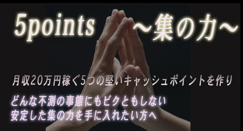 「5pointsプログラム」は、アドセンス、PPC、facebook、情報販売、メルマガの5つをバランスよく稼ぎの柱にするアフィリエイトマニュアルです。