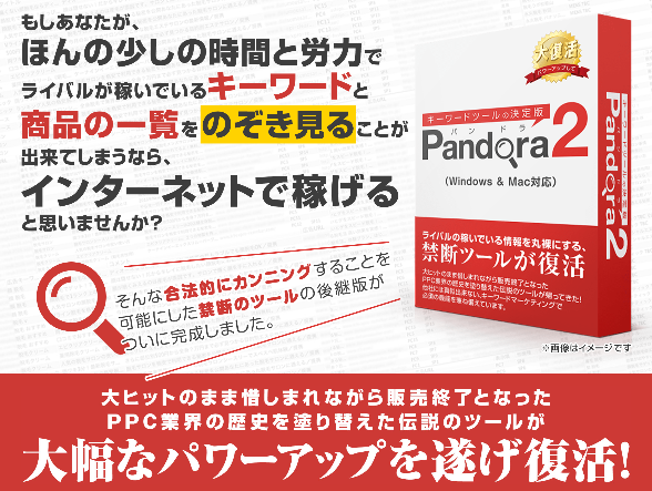 「Pandora2」は、1日で1000万円以上売れて、数千人の個人、法人の方が手に入れた伝説のキーワードツール『Pandora』の後継ツールです。
