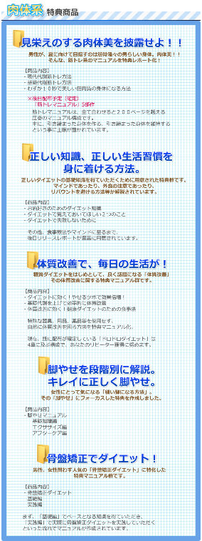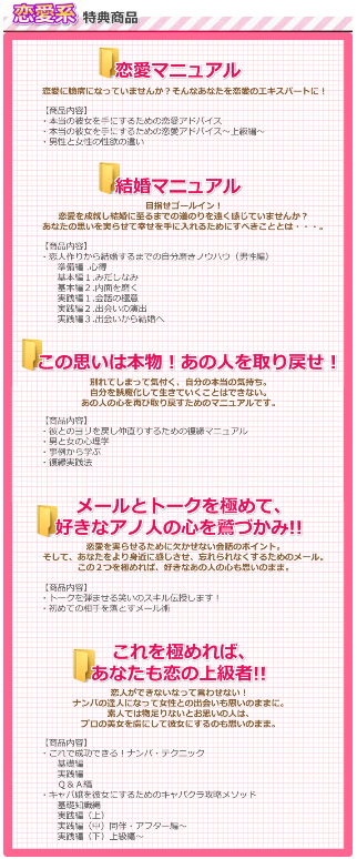 恋愛系(復縁、モテ、メール術等)や肉体改造系(ダイエット、筋力トレーニング等)を行う際に役立つ「特典そのもの」が、全部で57種類用意されています。