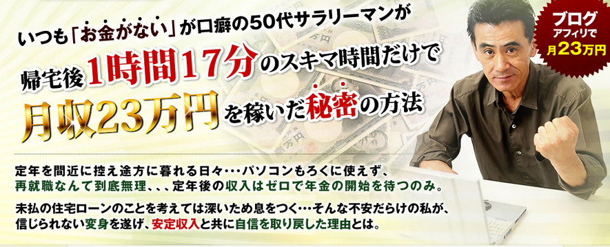「ブログで23万最先端アフィリエイトビジネス」は、1日1時間少々の作業で月に23万円を稼げるようになったブログアフィリエイトノウハウです。