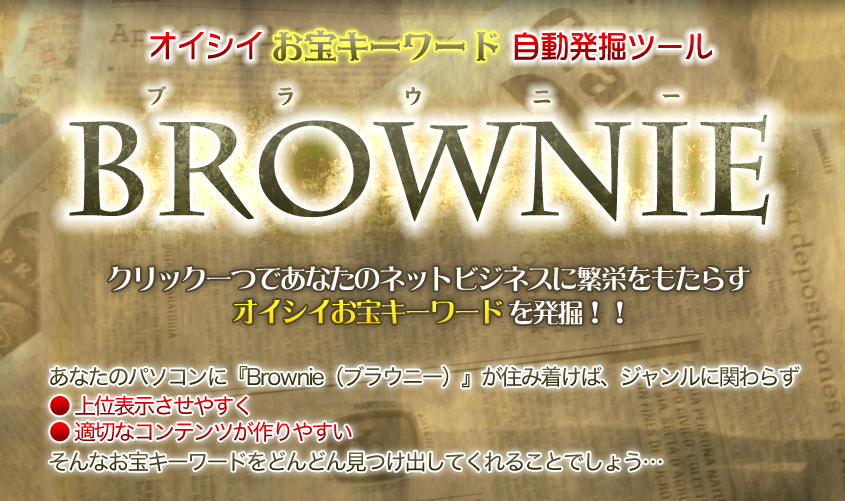 正式名称 『Brownie(ブラウニー)』オイシイけれどお菓子じゃない!何がオイシイかは使えばワカル!ザクザク見つかるお宝キーワード。超強力なキーワード発掘ツールが遂に誕生!