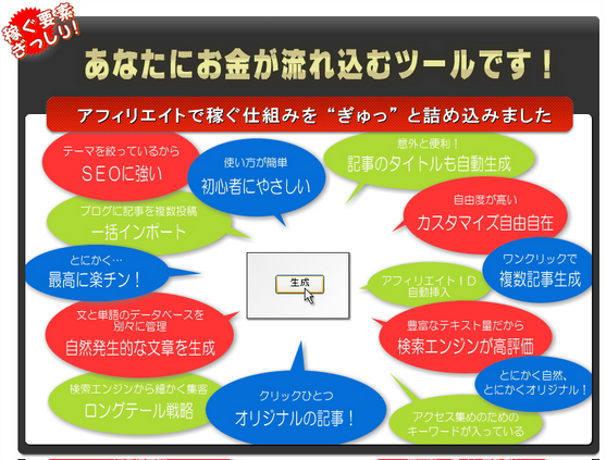オリジナルのコンテンツで、しかも人が読んでも不自然でない文章の作成が可能ですので、 当ツール作成のコンテンツがスパムフィルターに引っかかるということはまず考えられません。 実際、すでにこのツールを使ってみすずさんによって作成された何十という数のサイトが、Yahoo や Google に、きちんと認識され、アクセスを集めています。