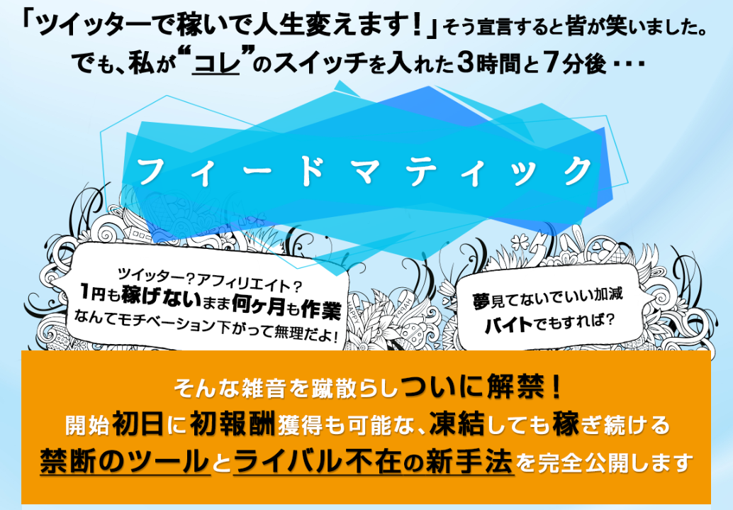 「フィードマティック」は、早い段階から初報酬を得ることができるツイッターアフィリエイトの総合パッケージです。