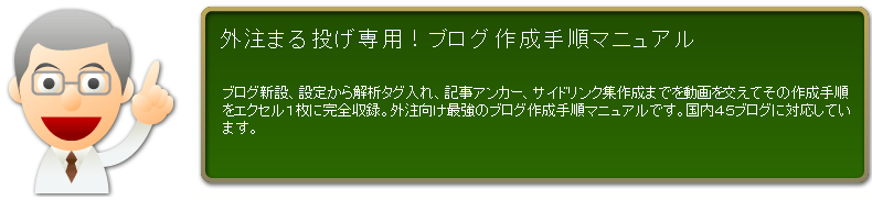 「外注まる投げ専用!ブログ作成手順マニュアル」は、ブログを開設したこともない外注さんに手取り足取りで、ブログ新設、設定から解析タグ入れ、記事アンカー、サイドリンク集作成までをエクセル一枚でまる投げできる優れものです。