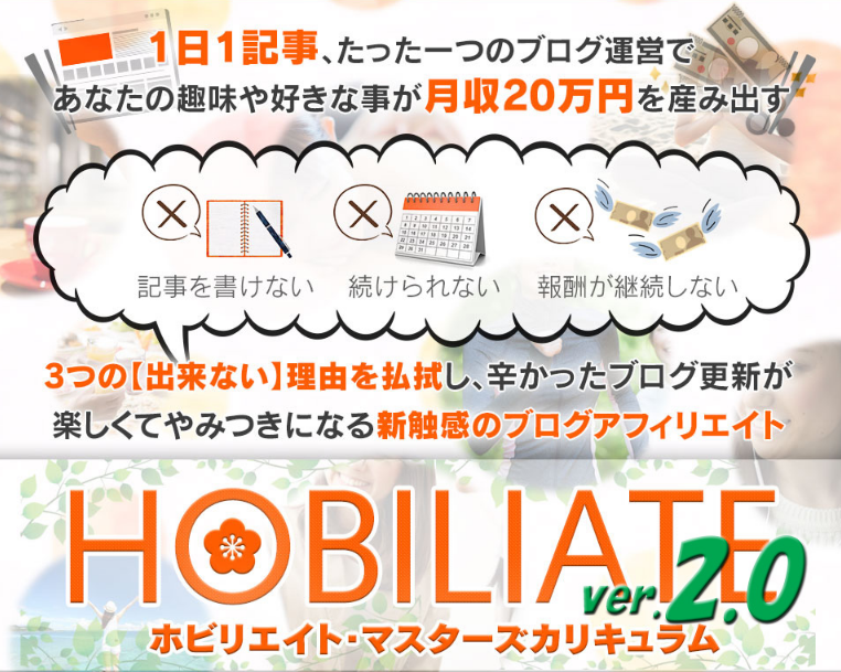 | 正式名称 | 1日1記事、たった1つのブログ運営で、あなたの趣味や好きな事が月収20万円を産み出す ホビリエイト2.0 |