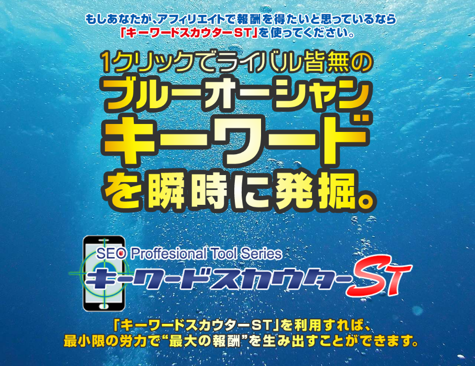 「キーワードスカウターST」は、ブルーオーシャンキーワードがザクザク見つかるキーワード発掘ツールです。
