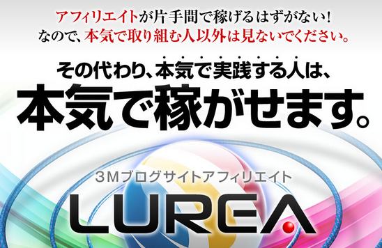 「LUREA」(ルレア)は、平均月収200万円以上の現役アフィリエイター(マメボーw、未来派野郎hiro、MOTO)が、集結して創り上げた3つの思考とノウハウ。それを支える強力なシステムとテンプレート。その全てを取り揃えたブログサイトアフィリエイト教材です。