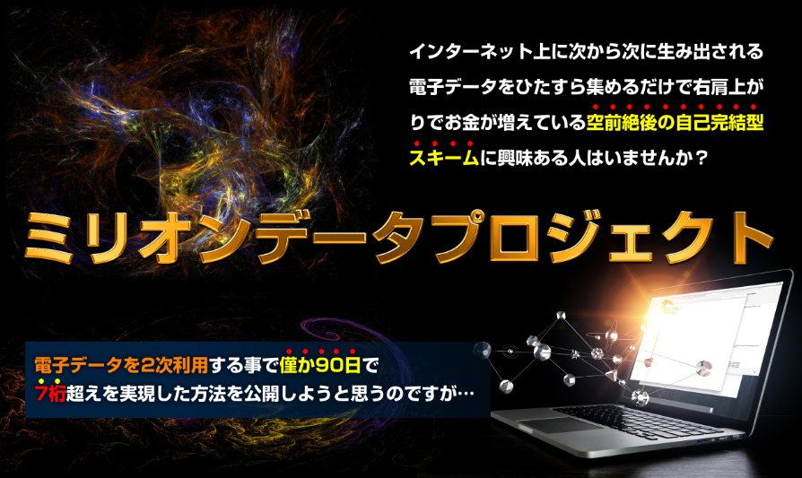 「ミリオンデータプロジェクト」は、僅か90日で7桁超えを実現した自己完結型のスキームです。
