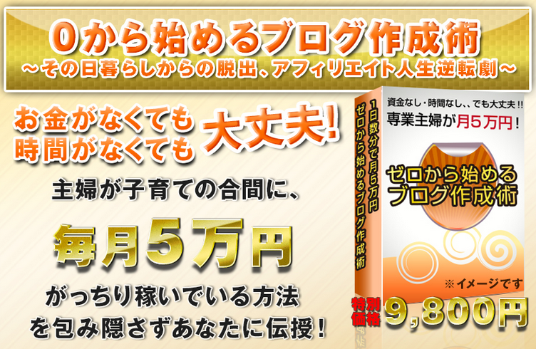 「0から始めるブログ作成術」は、主婦が子育ての合間わずか17分で月5万円を稼いだ秘密を公開したブログアフィリエイト教材です。