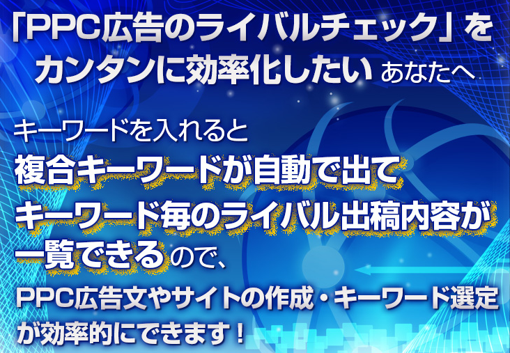 「PPCゲッター」は、キーワードを入力すると複合キーワードが自動で抽出され、さらにキーワード毎のPPC広告ライバル出稿内容が一覧できるツールです。