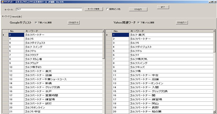 @例えば、PPCゲッターで「ゴルフ」と入力し「キーワード検索」ボタンをクリックします。