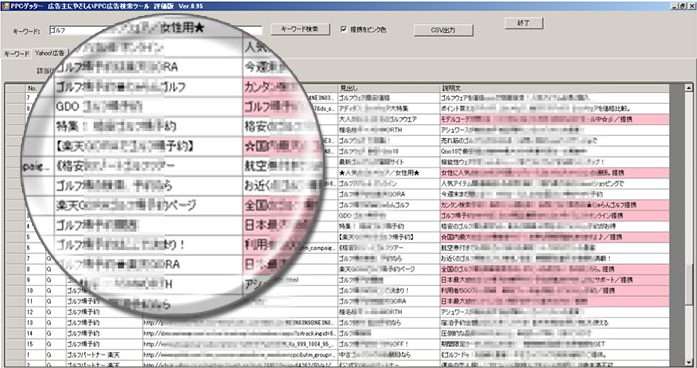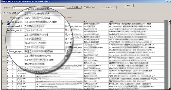 ツール上で見たい広告をダブルクリックすると、「広告主さんに広告費をかけない」で、PPC広告に出稿されている実際のホームページを見ることもできますし、ヤフープロモーション広告の検索結果は「CSVファイル」に保存することもできます。