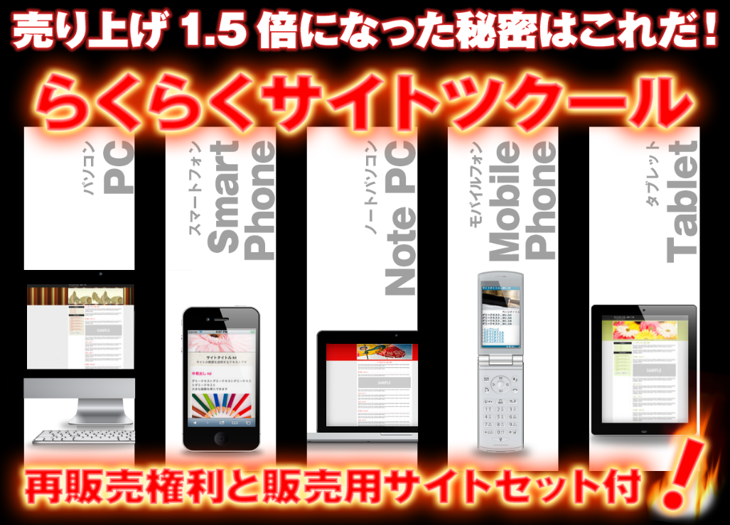 各デバイスに対応したサイトを楽々作れて、さらに再販売権付きでツール販売での売上も可能!