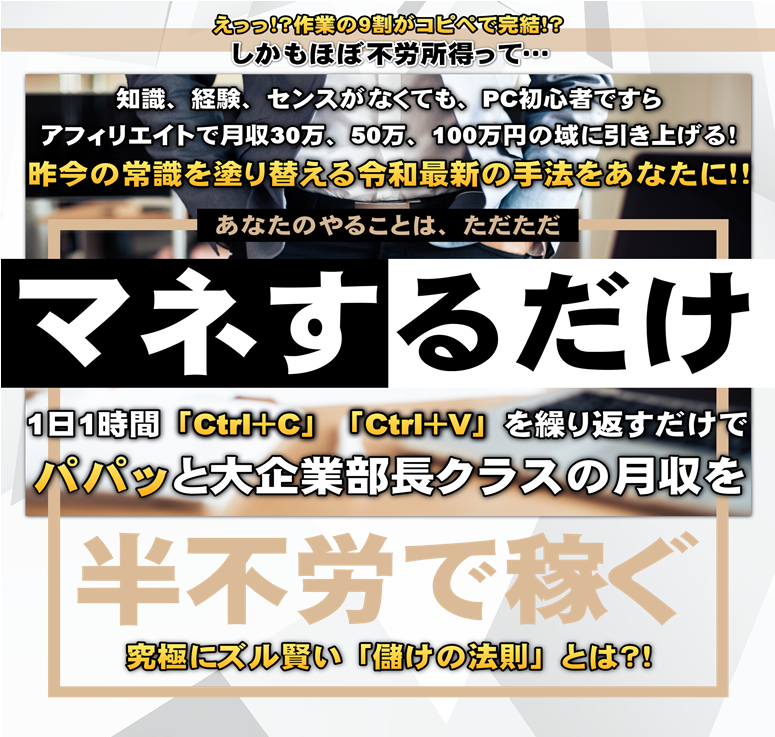 Revelation Affiliateの戦略で実践いただければ、労力を10分の1以下にしつつ、スキルや知識等を一切必要とせずとも、ただただ「マネするだけで」月収100万円が可能となります。