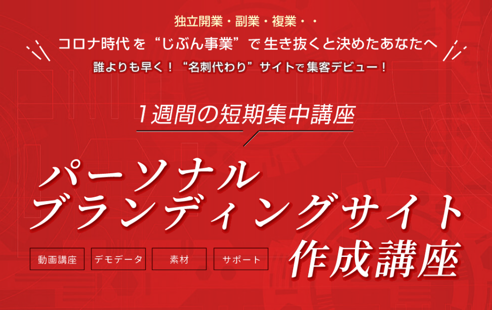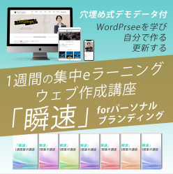 | 正式名称 | 1週間でサイトを作る!動画マニュアルとコンテンツデータ&素材&サポートのセット WordPressで作る!ホームページ作成講座「瞬速」パーソナルブランディングサイト作成講座 |