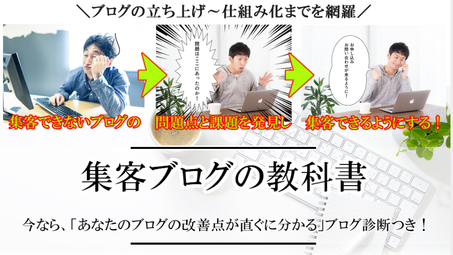 「集客ブログの教科書」は、ブログを使ったWeb集客でお悩みの方にオススメの教材です。