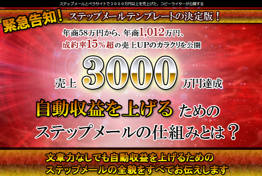 | 正式名称 | ★3000万円以上、自動収益を上げるためのステップメールの仕組みを公開!年商58万円から成約率15%年商1012万円を売上げたSMTステップメールテンプレートとは? |