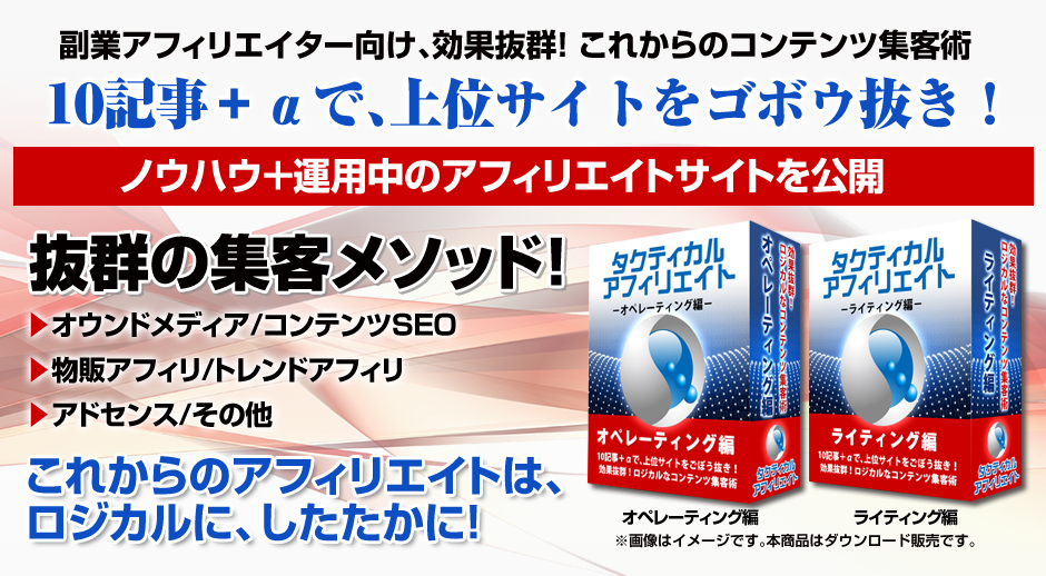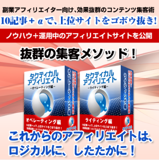 | 正式名称 | 10記事+αで上位サイトをゴボウ抜き【タクティカルアフィリエイト】 これからのアフィリエイトは、ロジカルに!したたかに! |