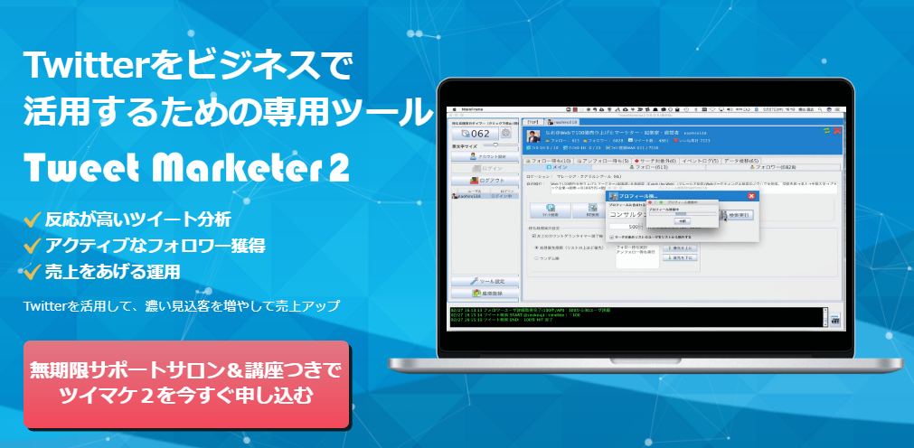 「Tweet Marketer2」は、Twitterをビジネスで活用して結果を出すノウハウをツール化した月額制の専用ツールです。